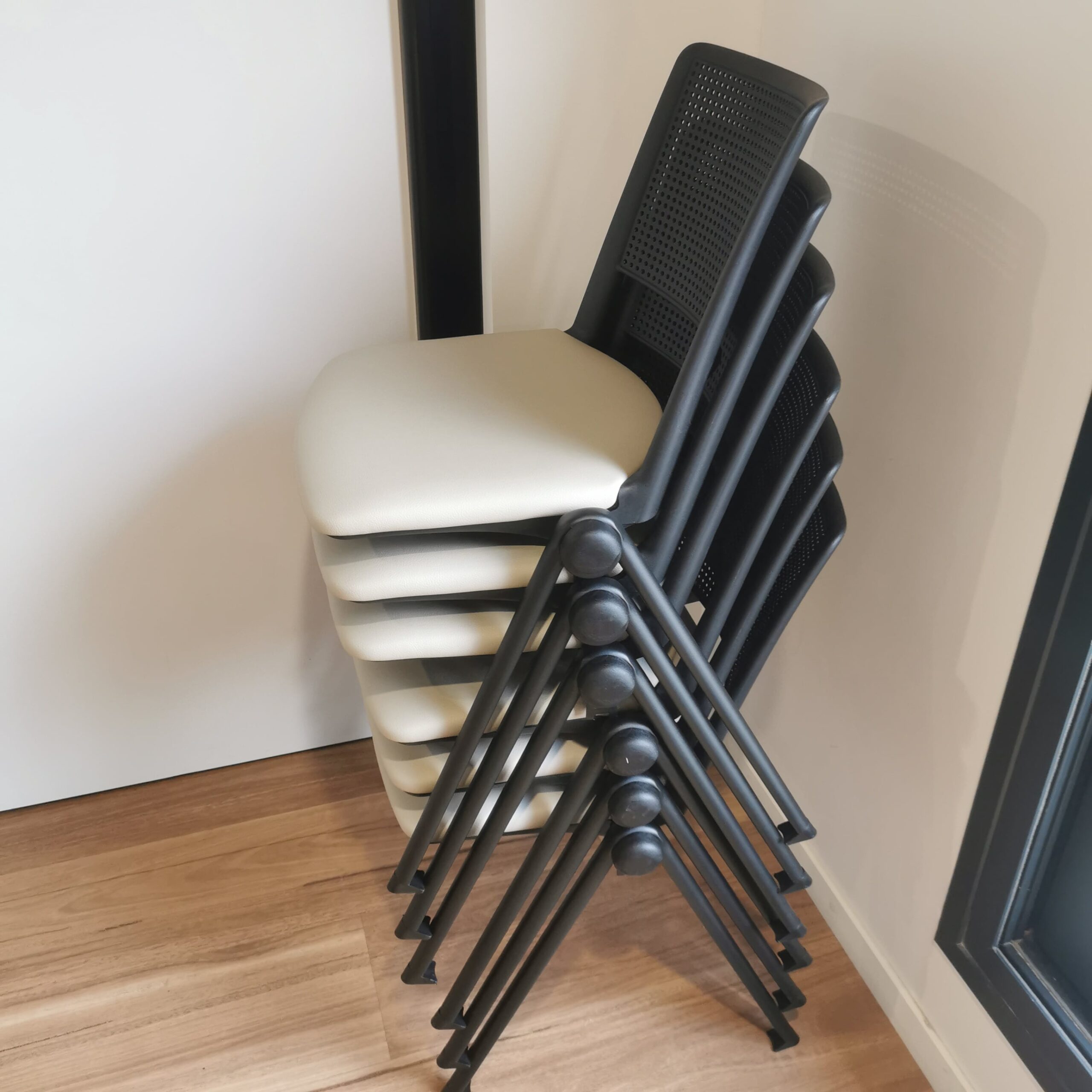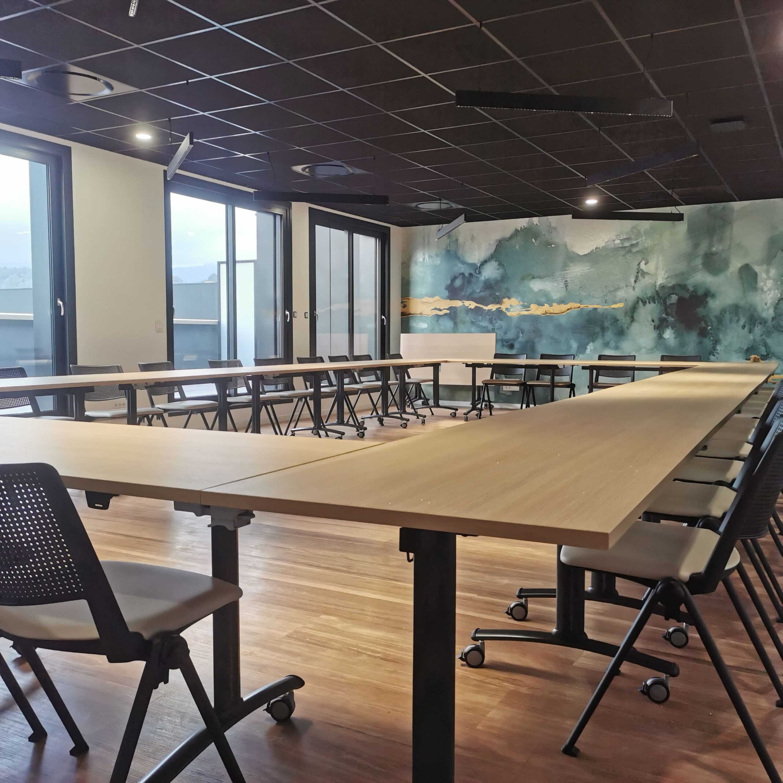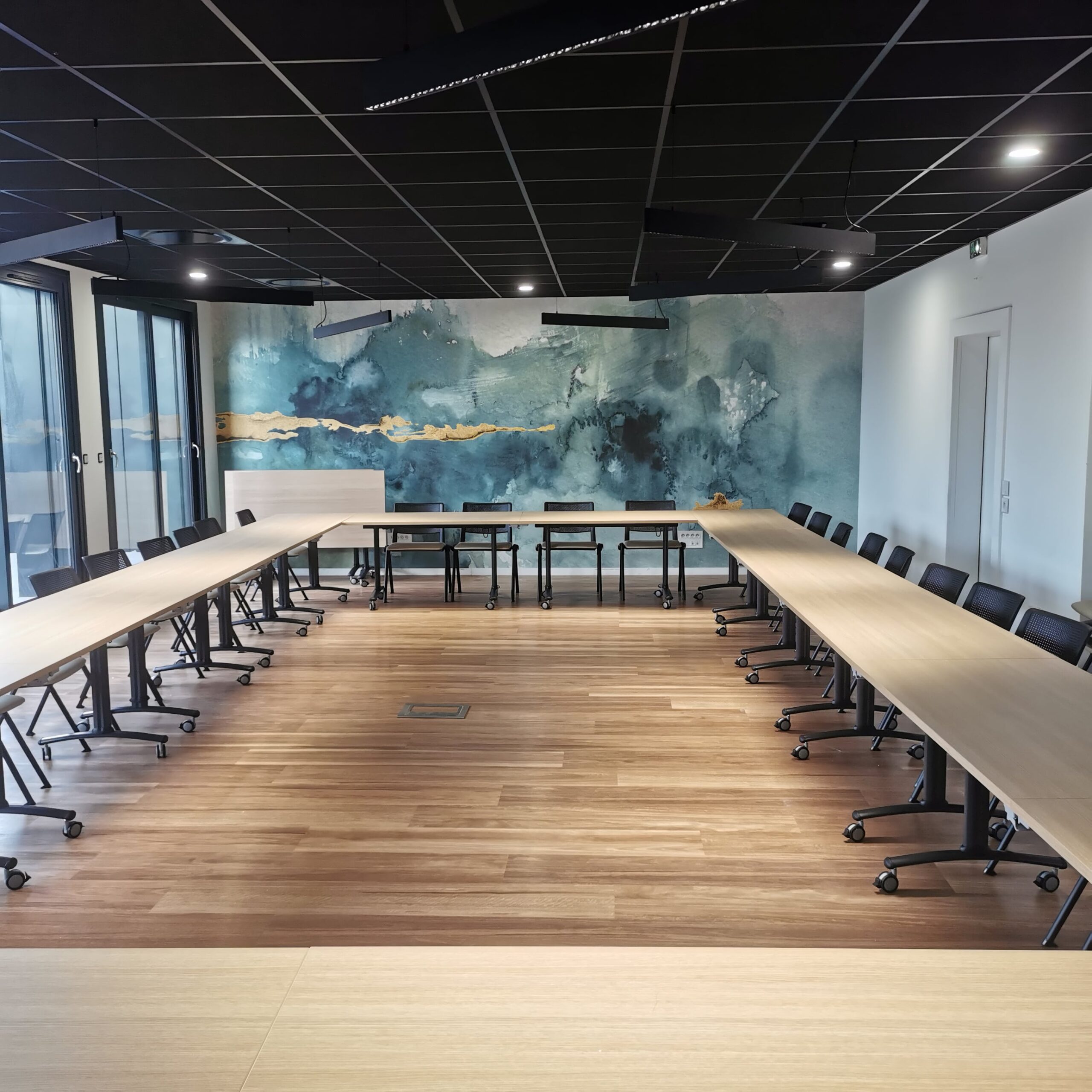 Aménagement d’une salle de réunion pour 32 personnes, pensée pour offrir une grande modularité. L’espace est équipé de tables basculantes sur roulettes avec plateau mélaminé et de chaises légères et empilables, permettant de reconfigurer facilement la salle selon le type de conférence ou de réunion. L’ensemble du mobilier a été choisi pour sa durabilité, sa résistance et sa flexibilité, afin de s’adapter à différents usages.