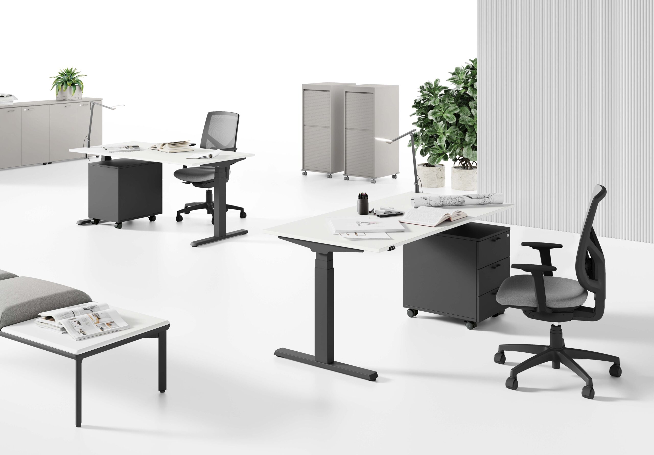 Nos bureaux sont disponibles dans une variété de styles, matériaux et finitions pour s’harmoniser avec votre espace et votre identité visuelle. Dotés de mécanismes manuels ou motorisés, ils sont faciles à utiliser et peuvent être adaptés aux préférences individuelles de chaque utilisateur.