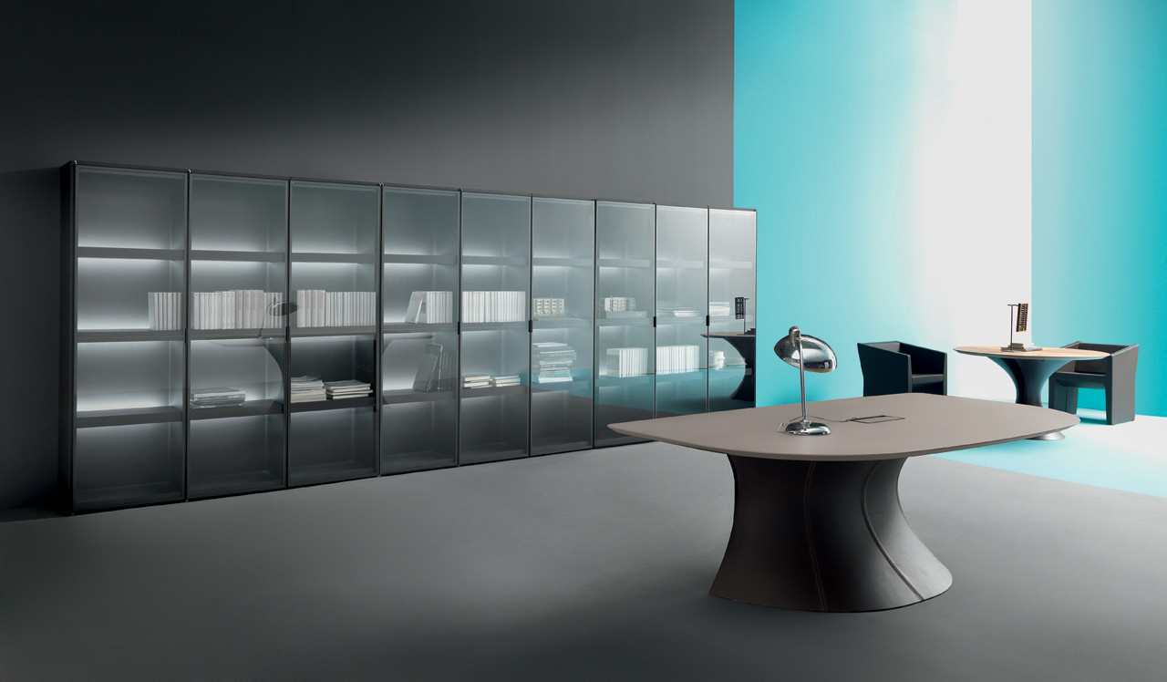 Les plateaux, disponibles en noyer, laqué mat, verre laqué ou cuir, offrent une esthétique raffinée et personnalisable. Les bords biseautés à 30° ajoutent une légèreté visuelle à l’ensemble.