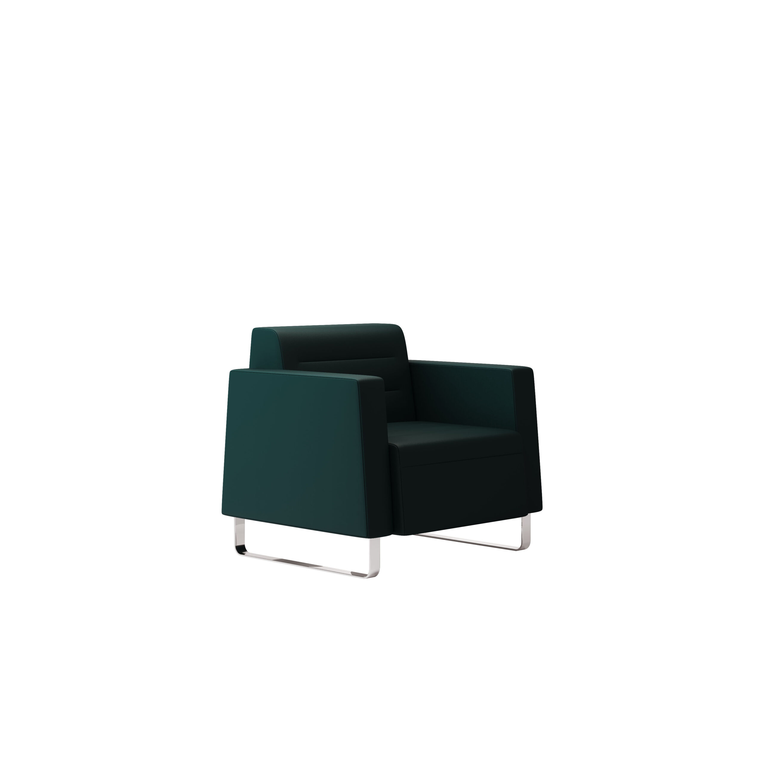 Son design géométrique monolithique est subtilement adouci par la silhouette des accoudoirs et les pieds annulaires en acier chromé poli, conférant au canapé une allure raffinée.